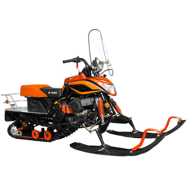 Dingo T150 — третье поколение компактного и удобного разборного снегохода, спроектированного русскими инженерами. На новый Dingo установлен более мощный, чем на предыдущие версии, 4-тактный двигатель с принудительным воздушным и дополнительным масляным охлаждением объемом 149,6 кубических сантиметров. Удлиненная до 2 626 мм резинотканевая армированная гусеница, с увеличенными до 23 миллиметров грунтозацепами, и усовершенствованная, принципиально новая, катково-склизовая подвеска с двумя амортизаторами, обеспечивают снегоходу отличную проходимость. Dingo T150 оборудован электростартером с резервной системой ручного запуска. Несмотря на свою компактность, Динго способен перевозить до 150 килограммов веса. Снегоход Dingo станет незаменимым помощником в хозяйстве.